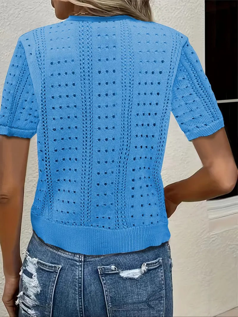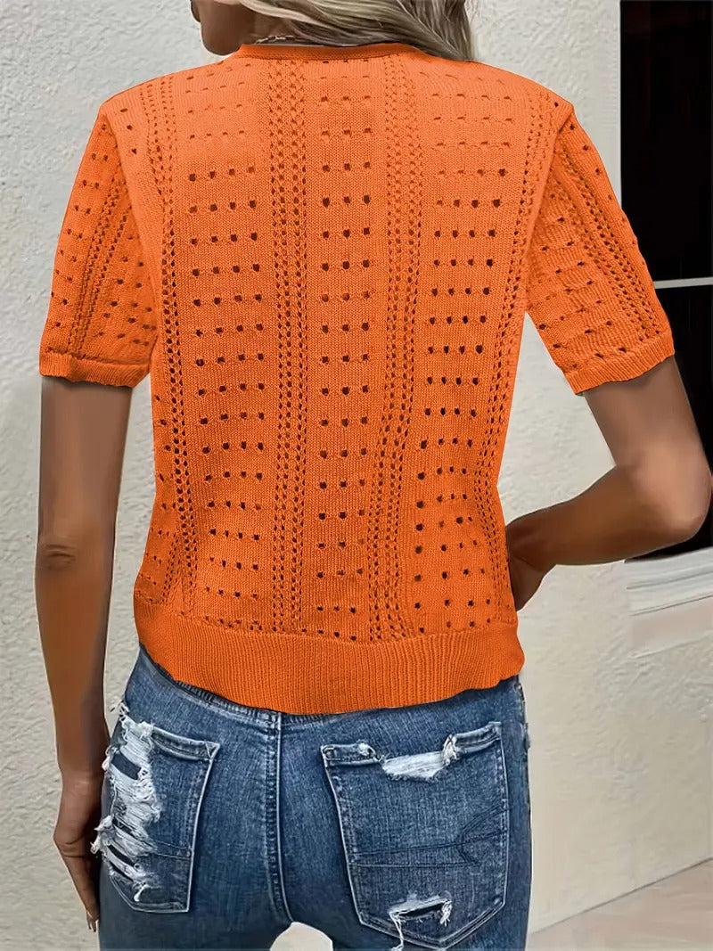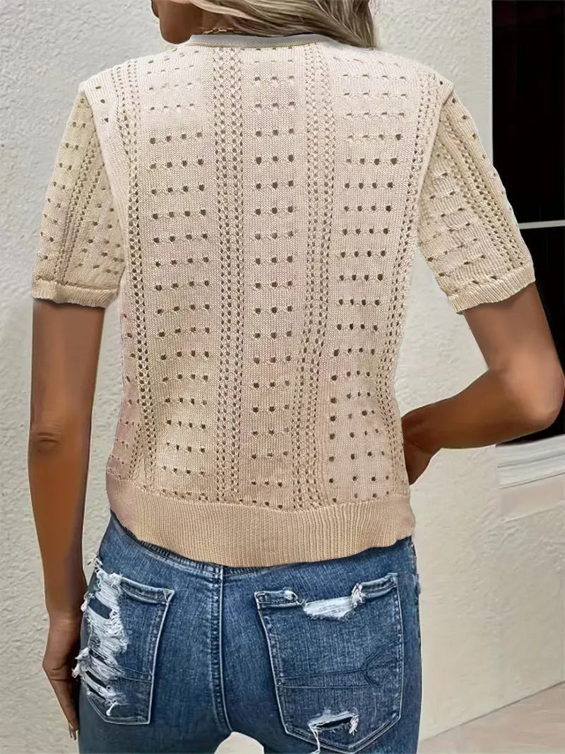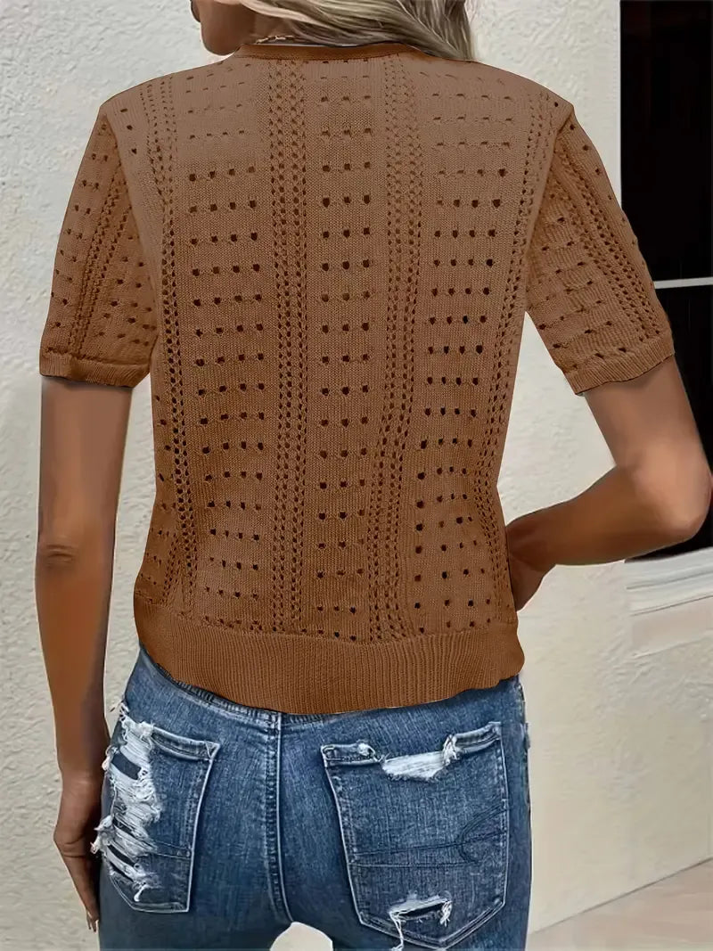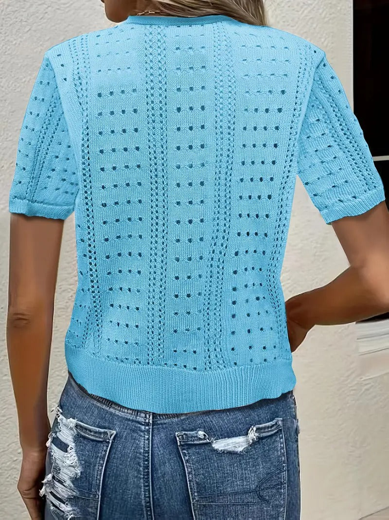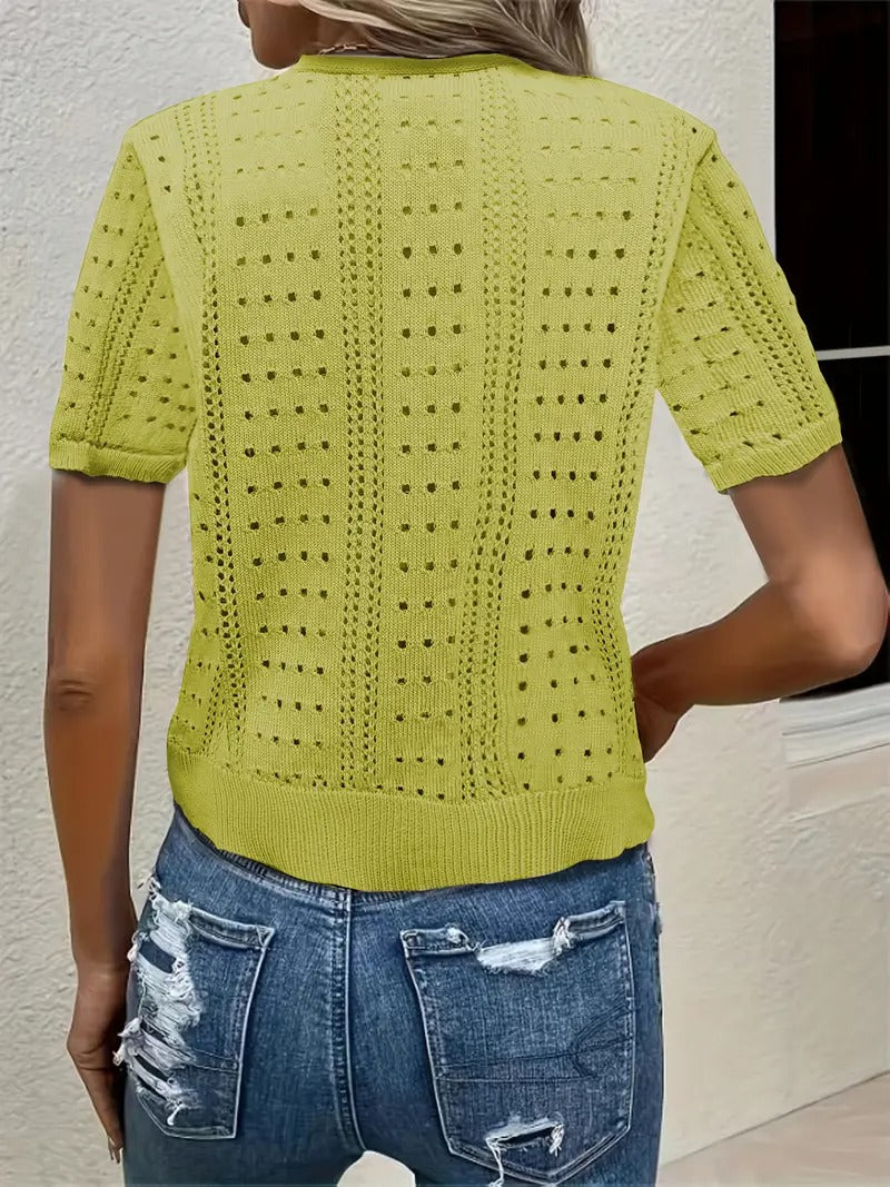 Spring Cardigan, Summer Cardigan, Short Sleeve Knitwear, Semi Sheer Cardigan, V Neck Knit Top, Lightweight Cover Up, Elegant Knit Cardigan, Hollow Out Cardigan, Women's Summer Sweater, Knit Viscose Top, Breathable Summer Clothing, Mid Elasticity, Solid Color Knit, Stylish Layering Piece, Warm Weather Cardigan