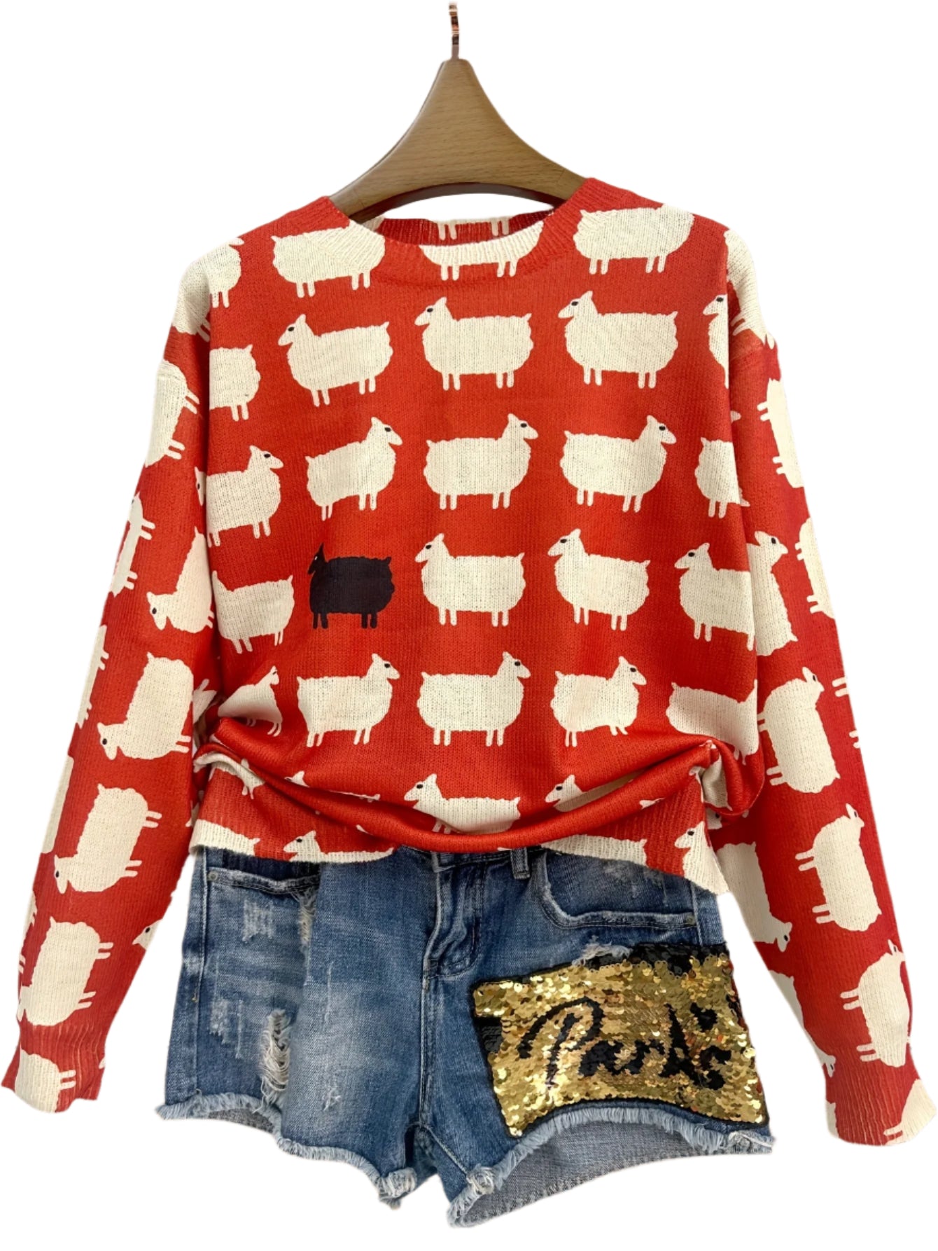 Dare to stand out with the Lumachic Black Sheep Sweater. Crafted from soft, breathable knit, this playful piece features an all-over white sheep pattern with one bold black sheep — a charming nod to individuality. Cozy yet eye-catching, it's a conversation starter you'll want to wear on repeat.